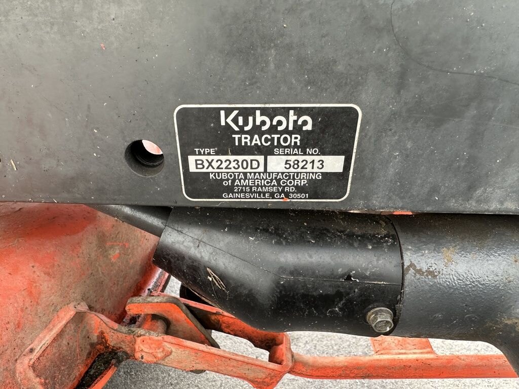 2004 Kubota BX2230D sub compact tractor. Unit is equipped with selectable 4WD, HST Transmission, 2 speeds and a differential lock. Unit has both a mid and a rear PTO. Machine is equipped with lights and turn signal on the front and rear. Unit has a 60" side discharge mid mount mower. Unit has full 3pt hitch on the rear and has added handle bars onto the side of the unit! Unit has 870 hours on it!