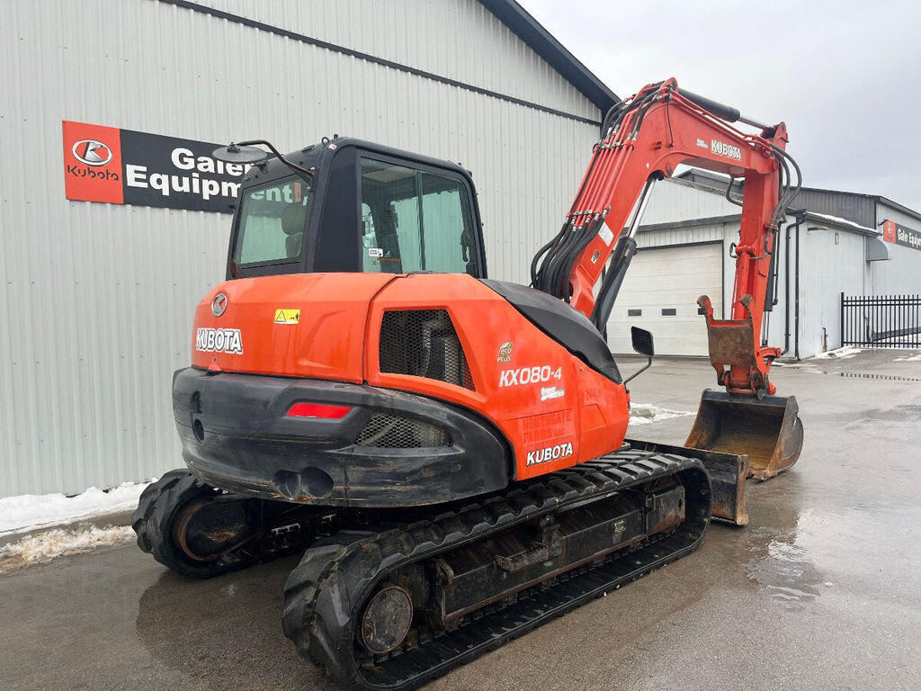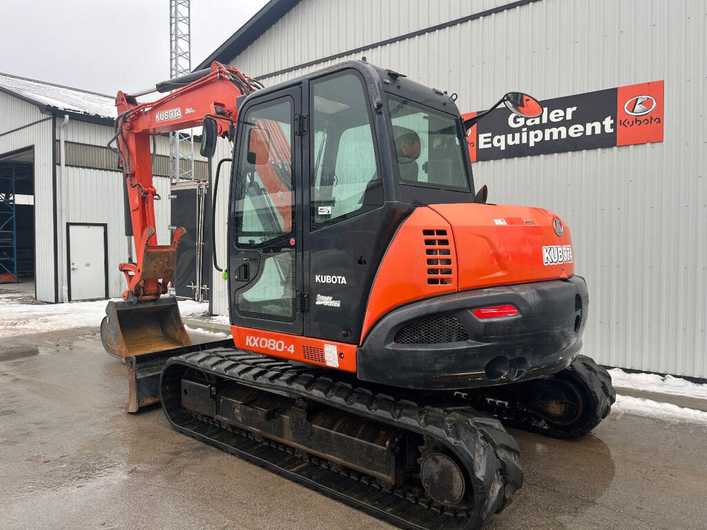 A well-equipped Kubota KX080-4S with cab, thumb, and coupler — available now for $72,000 + HST.