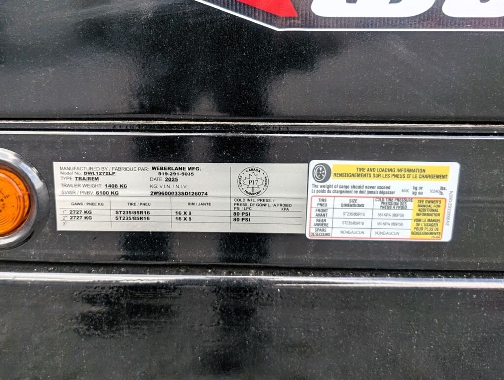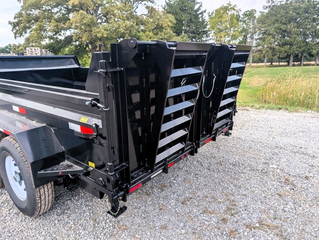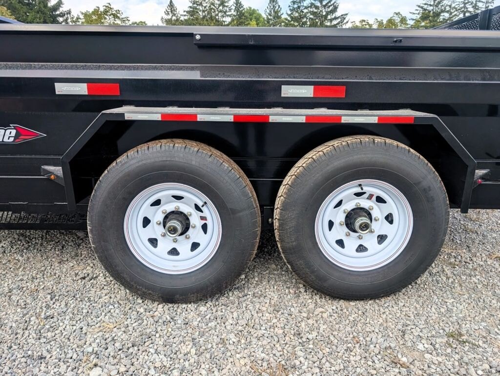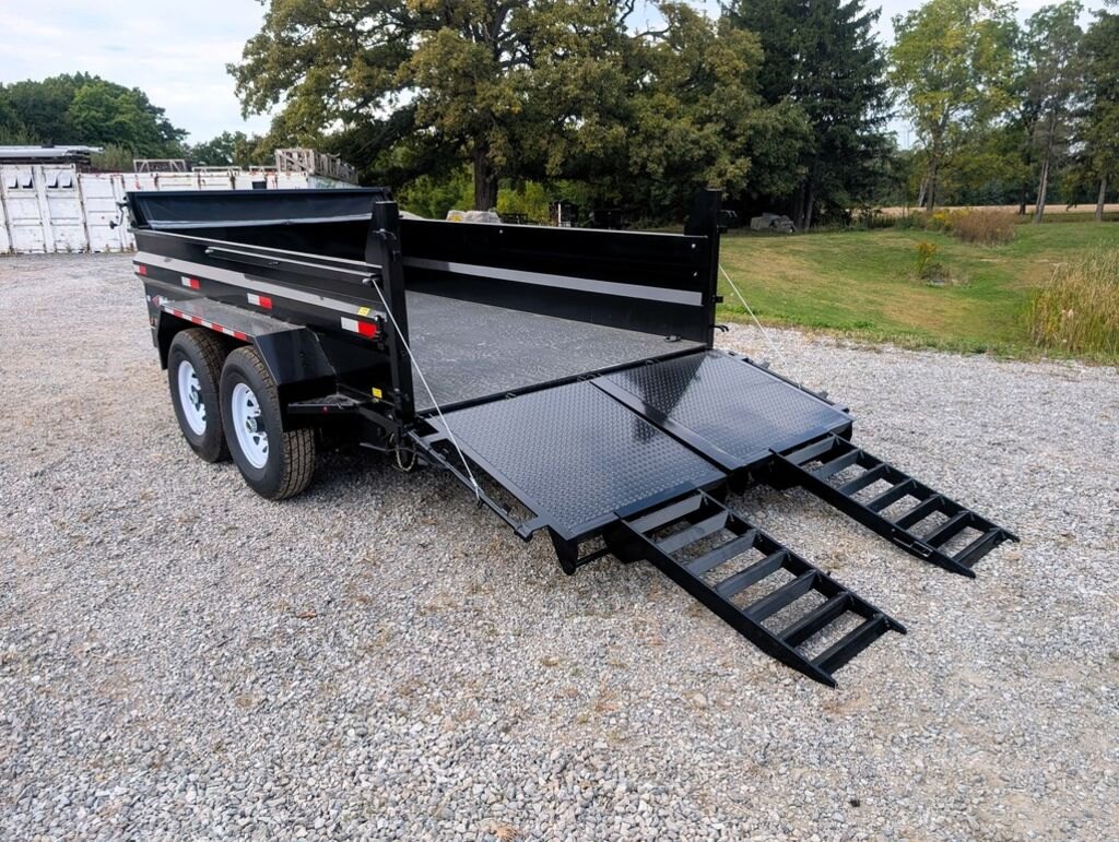 78"x12' dump trailer, tandem 6,000lb drop axles, brakes on both axles, slipper springs, greaseable wheel bearings, 15" radial tires, rear combo doors - ramps/barn door, sealed wiring & LED lights, d-ring tie downs, 7,000lb jack, rear stabilizers, tarp cover, 3/16" steel floor, front pole piston hoist, 24" sides \ 10" gussets, 8,100 lbs payload, comes with deep-cycle battery