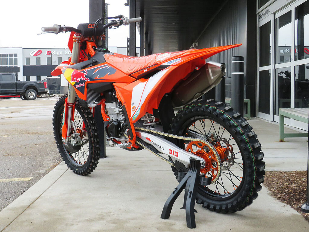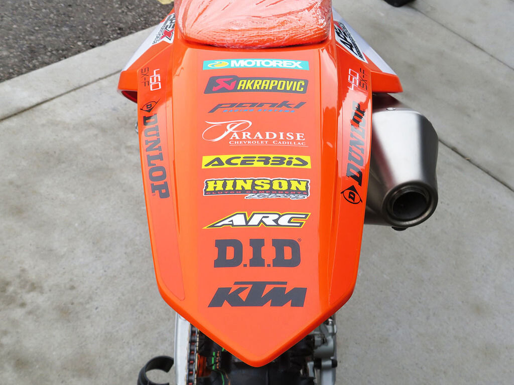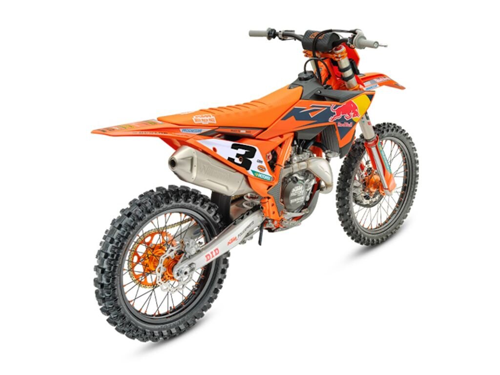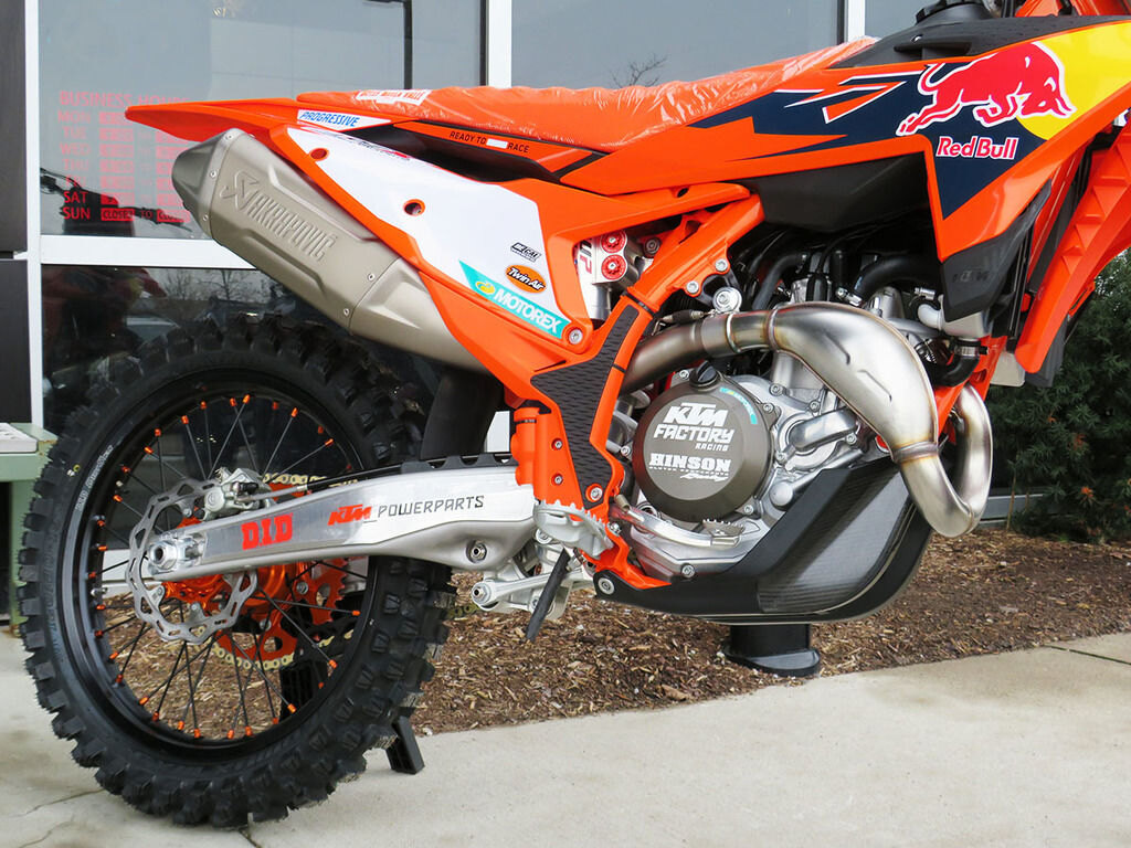 When the gate drops you need to be the first to off the line in a bid to rule (and make) the roost. The 2026 KTM 450 SX-F FACTORY EDITION boasts one of the strongest and most versatile 4-stroke powerplants in the pits, with its SOHC engine proving to be the perfect example of advanced engineering. With class-leading peak power output, and an overall engine weight of only 59 lb (26.8 kg), you'll leave the competition with more than a little mud on the face. The 2026 KTM 450 SX-F FACTORY EDITION features an updated Akrapovic muffler, intake, and mapping, which increases rideability while meeting the latest FIM and AMA sound regulations. Crafted from lightweight titanium, the muffler's premium finish reflects its high-performance design -- and is available exclusively on this limited-run model.