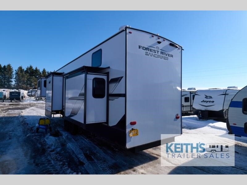 You will find the perfect balance of size, space, features, and luxury with any one of these Forest River Sandpiper fifth wheels! They are constructed with a welded aluminum framed vacuum bonded laminated superstructure, a cambered powder coated frame with rust prohibitor, and a fully enclosed underbelly for added protection against the elements. The large tinted windows come with a 80/20 UV prohibitor or you can choose the optional dual pane windows. Some hassle-free amenities include a 60k BTU on-demand water heater, full coach water filter system, tire pressure monitor system, and an electric leveling system! Inside, you'll enjoy stainless steel appliances, solid surface countertops, Beachside Sundance linoleum, recessed residential lighting, and many more comforts!