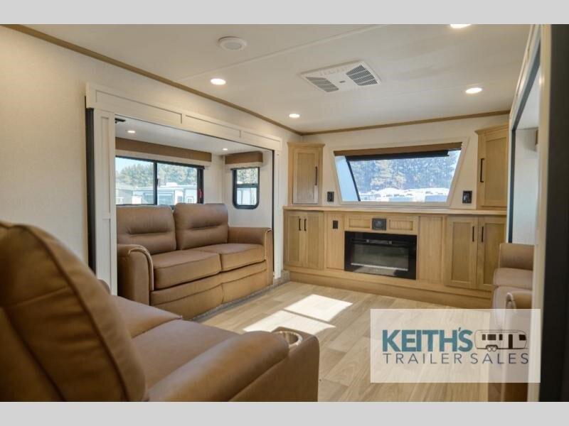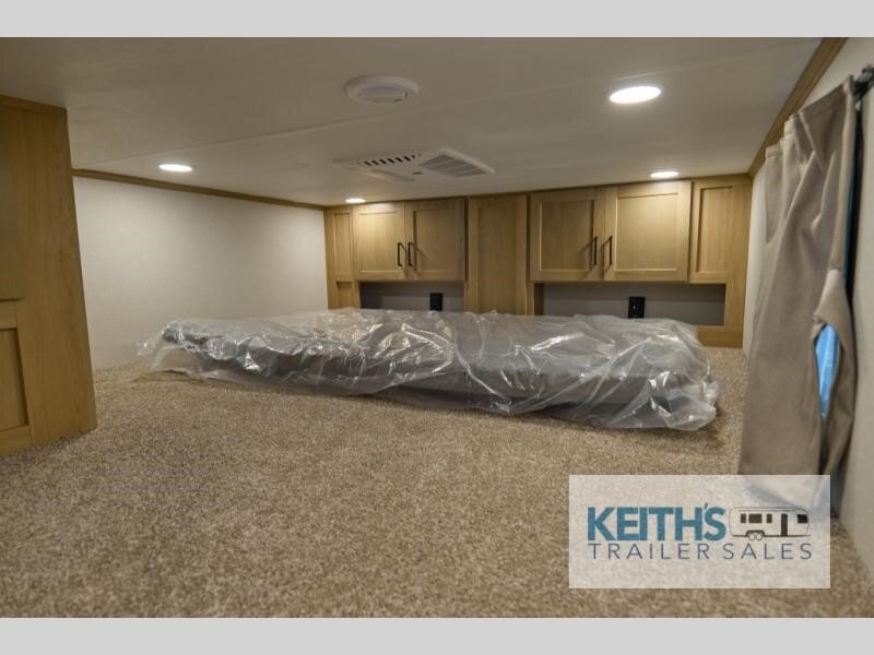 Wow! Check out this fifth wheel with a full loft for the little ones with two bunk mats, two wardrobe bookcases and a wardrobe/cabinet for ample storage. The main floor includes five slides for maximum space, a front living area with dual hide-a-bed sofas, plus an entertainment center with a 50" flat screen TV for movie nights! Once your guests have converted the living room to their bedroom at night, you can take the rear private bedroom. There is a king bed slide out here, a wardrobe, plus a closet with washer and dryer prep for full-time living. The full bath is easily accessible for everyone, and the middle kitchen will be a favorite with the chef of your group. Here, you'll find a 12V refrigerator, an island, tons of counter space, plus a hutch to display nice dishes, and a pantry for dry goods. Don't let this fifth wheel slip away!