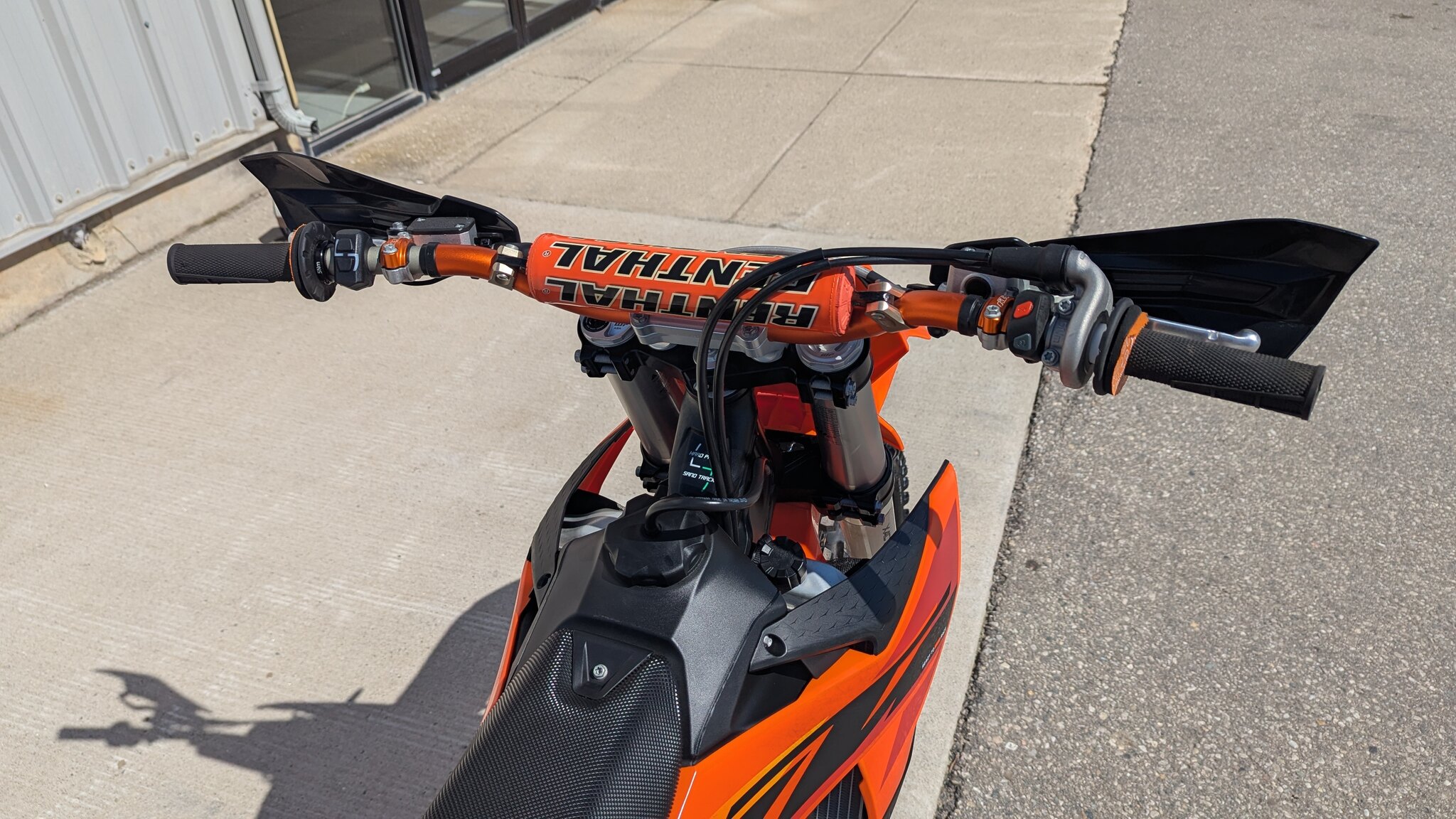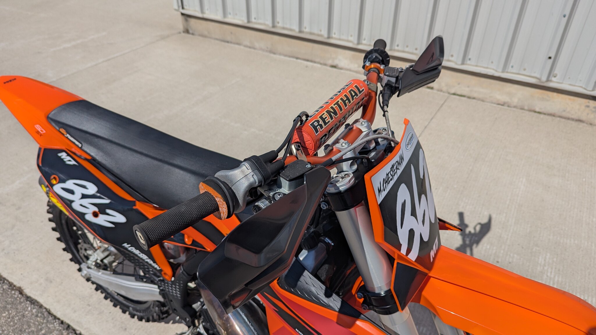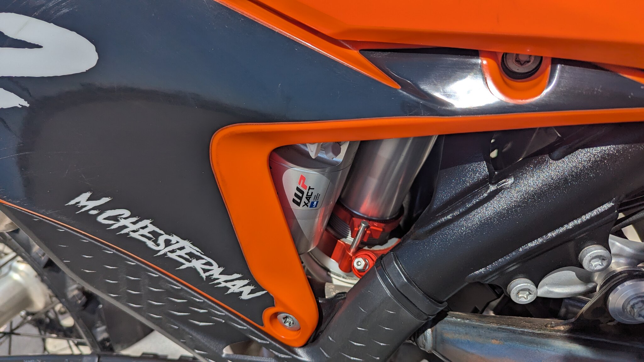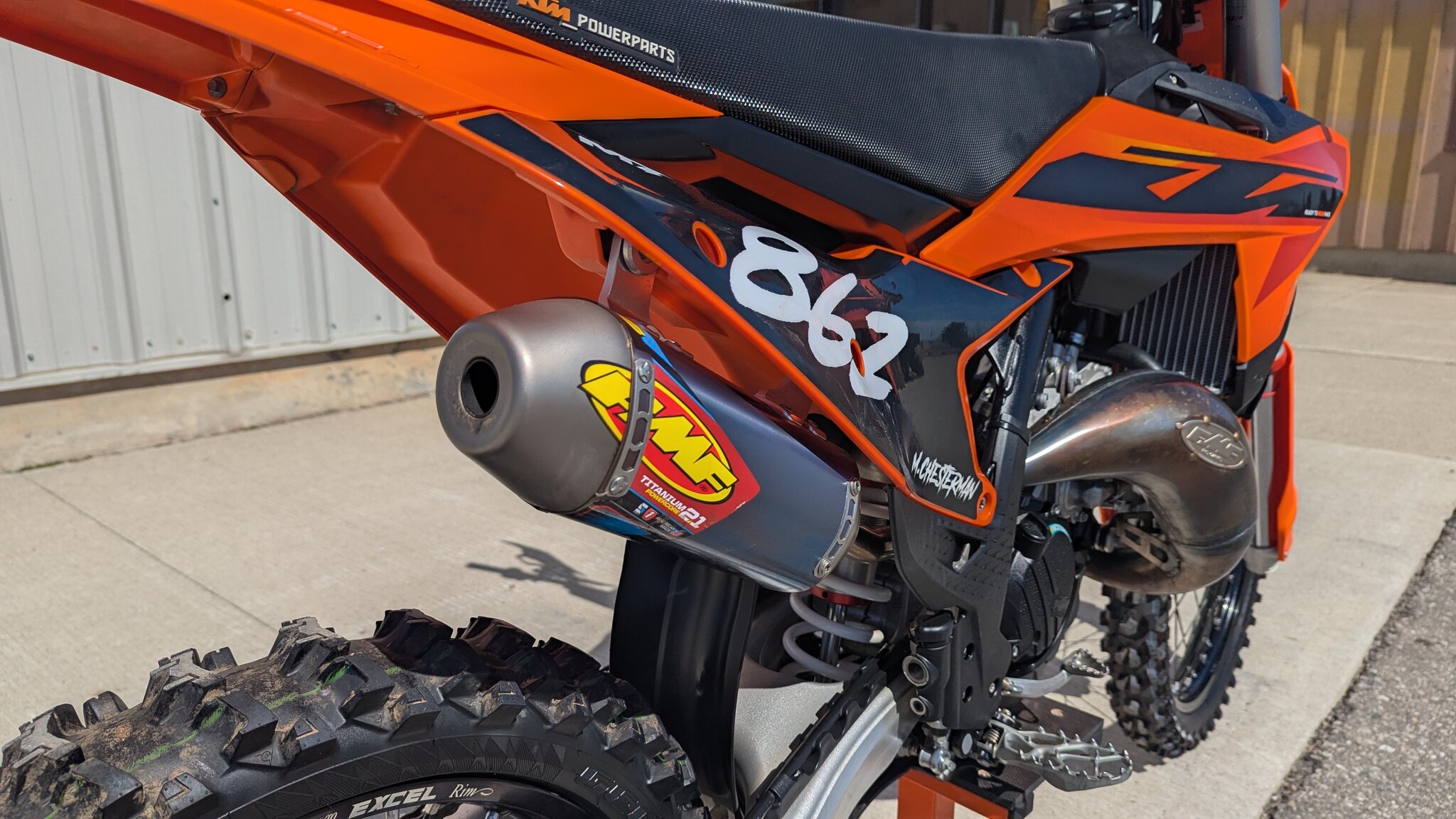 Upgraded with: - Rear Spring - 45-240 - 210 to 230 LB Rider (Comes with stock spring as well) - Acerbis Skid Plate - FMF Factory Fatty (Comes with stock pipe as well) - FMF Titanium Powercore 2.1 (Comes with stock cylinder as well) - KTM Tall Seat - A42005907001 (Comes with stock seat as well) - Renthal Twinwall Handlebars - KTM CNC Brake & Clutch Lever Clamps (Comes with stock clamps as well) - KTM Black Handguards - WP Fork Bleed Screws (Comes with stock screws as well) - Geomax MX14 Sand Tire (Comes with stock tire as well) - WP Shock Preload Adjuster (Allows you to turn spring easily with a socket) - M7 Custom Decals