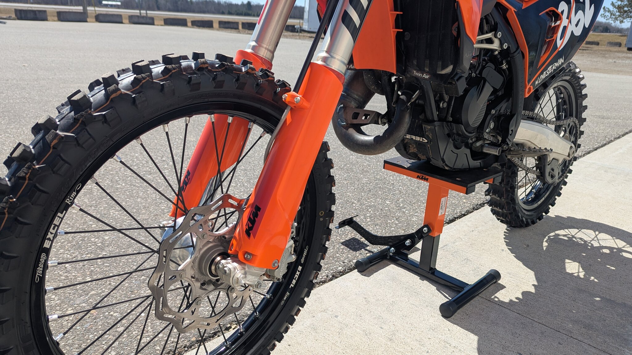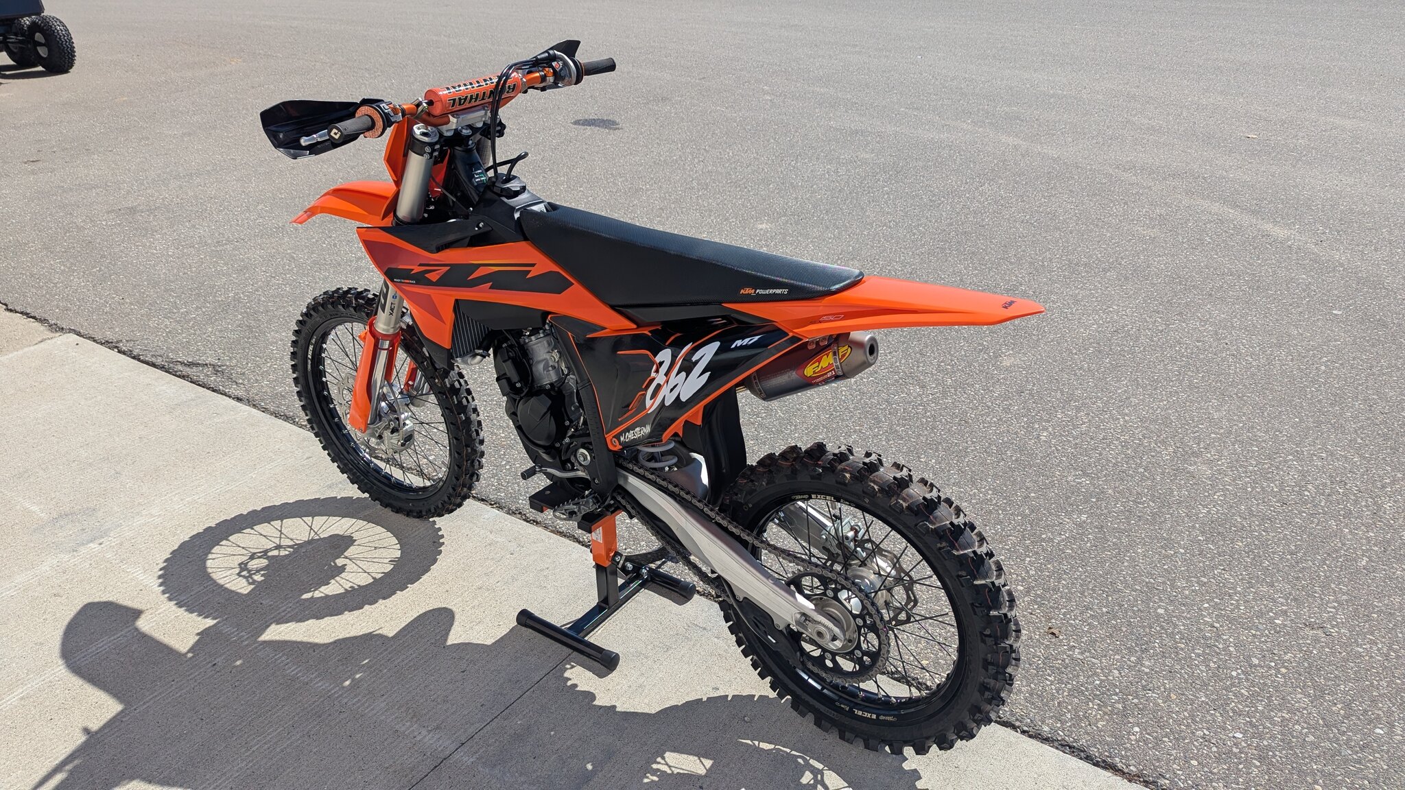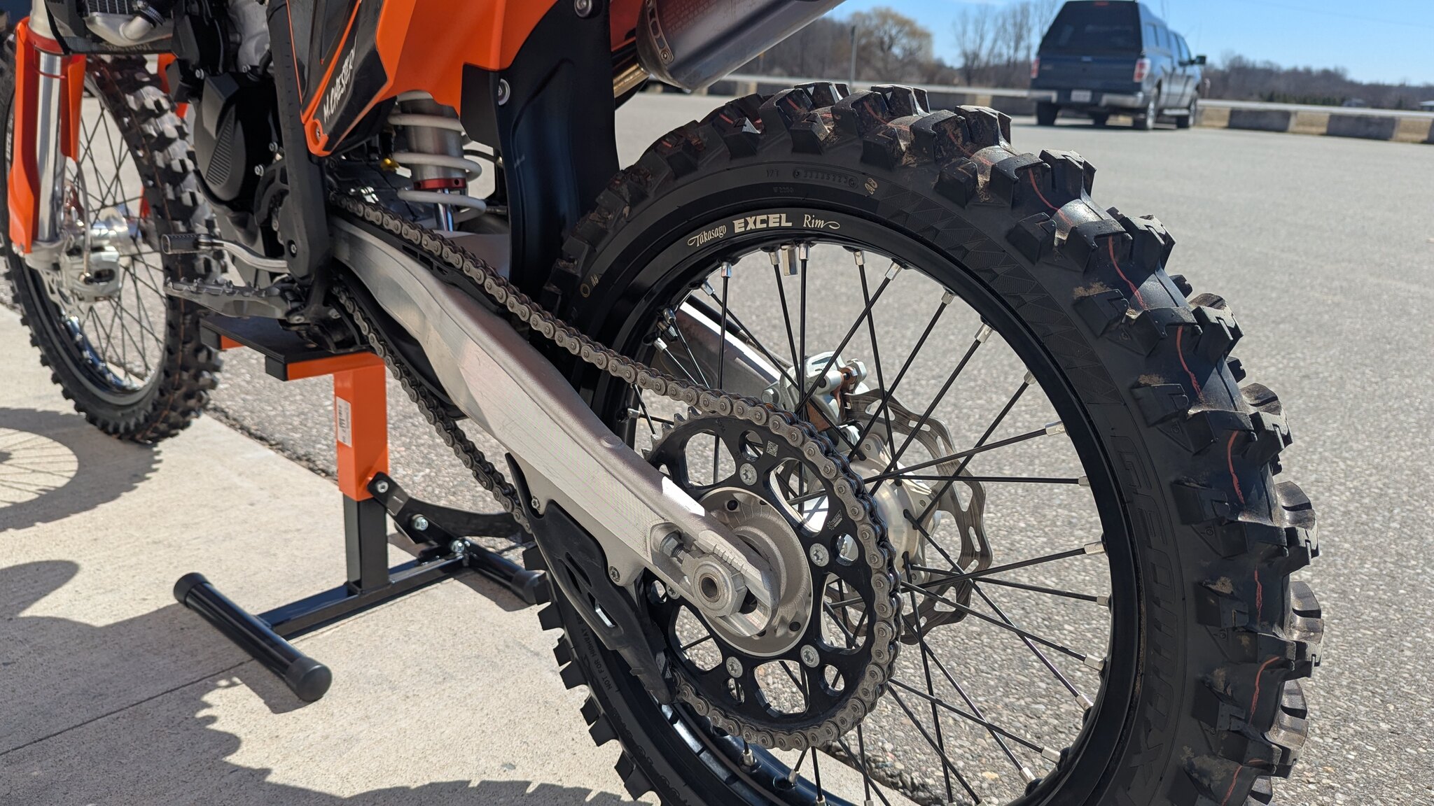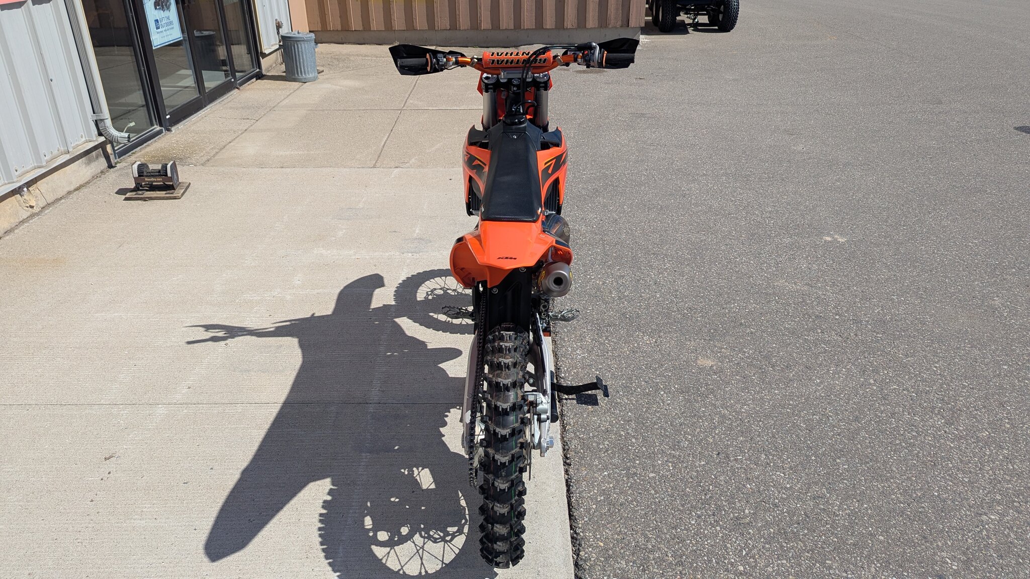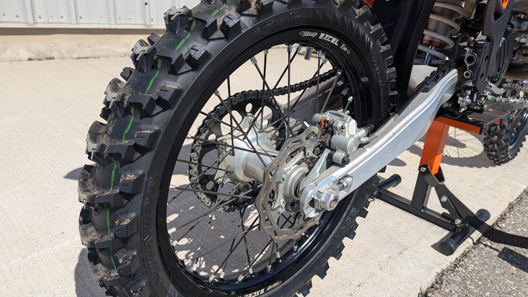 Upgraded with: - Rear Spring - 45-240 - 210 to 230 LB Rider (Comes with stock spring as well) - Acerbis Skid Plate - FMF Factory Fatty (Comes with stock pipe as well) - FMF Titanium Powercore 2.1 (Comes with stock cylinder as well) - KTM Tall Seat - A42005907001 (Comes with stock seat as well) - Renthal Twinwall Handlebars - KTM CNC Brake & Clutch Lever Clamps (Comes with stock clamps as well) - KTM Black Handguards - WP Fork Bleed Screws (Comes with stock screws as well) - Geomax MX14 Sand Tire (Comes with stock tire as well) - WP Shock Preload Adjuster (Allows you to turn spring easily with a socket) - M7 Custom Decals