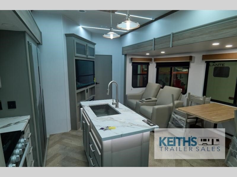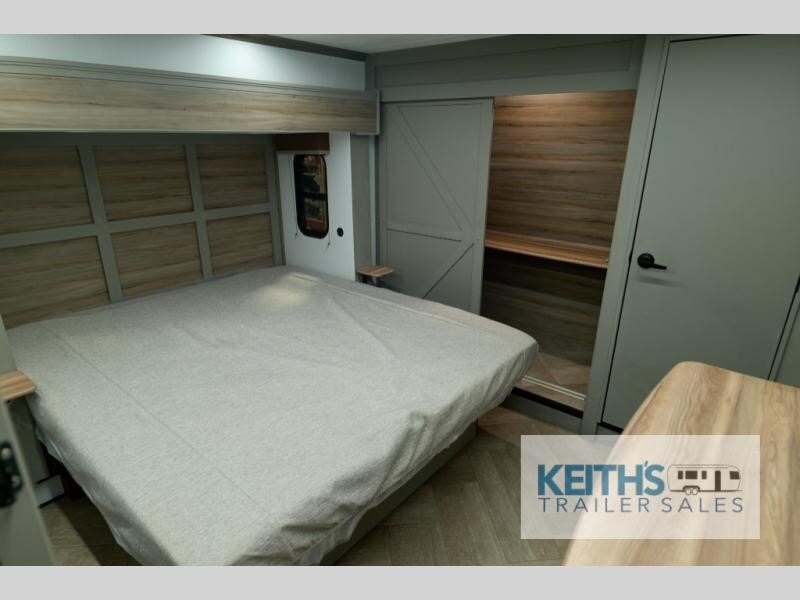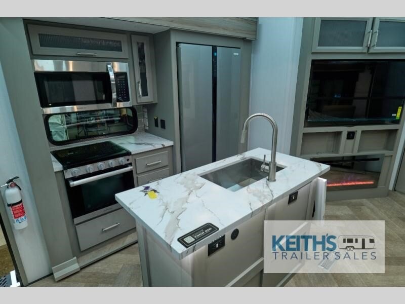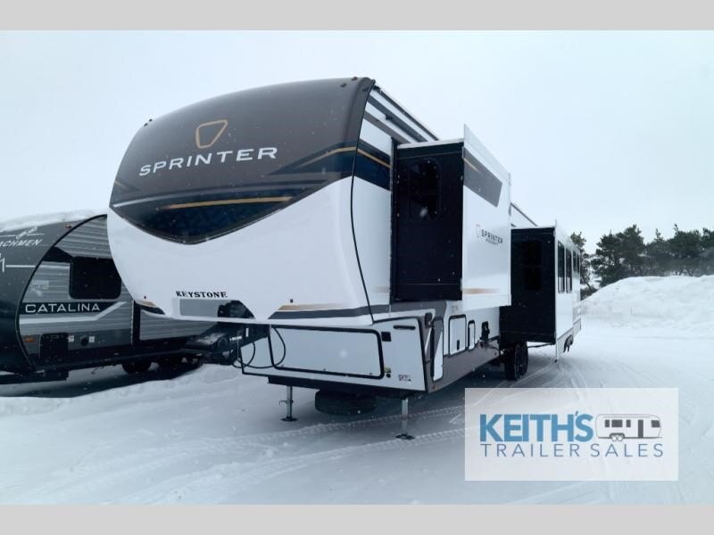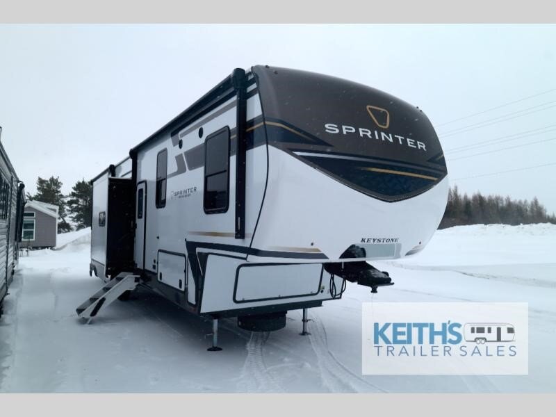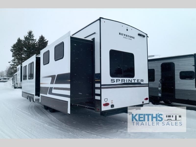 The Sprinter fifth wheels by Keystone feature spacious living areas, plenty of storage, and outstanding towability. Each unit is constructed with 2" thick double welded aluminum frame construction, a fully walkable roof and slide out roof, and dual layer insulation to help extend your camping season. The heated pass-through storage includes lockable slam latch baggage doors so you can easily pack your gear, and the one-touch 4-point leveling system features return hookup memory to have you set up in no-time. Head inside to find DynaSpan Marine Grade floor decking, Thomas Payne luxury collection furniture and residential style seamless marbled countertops to name a few comforts. The Sprinter also includes a Suburban tankless on-demand water heater, black out aluminum wheels, plus a 30k BTU furnace to ensure your comfort!