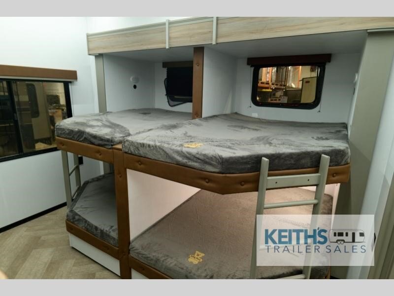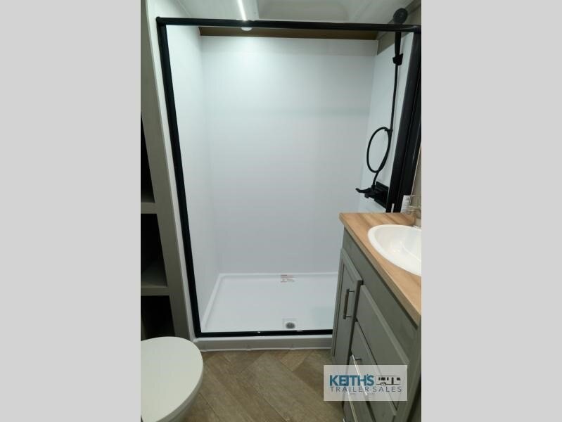 A bath and a half makes this fifth wheel a clean decision! From the moment you walk in you will be met with an open and inviting living and kitchen area. This area has full-reclining theater seating with massage, lights, and USB across from a fireplace and 50" LED HDTV, so you'll spend your nights in true comfort. Next to the theater seating is a booth dinette with hinged storage access which can be switched out for either a free-standing dinette or an optional super sofa that also replaces the theater seating. One of the best features of this fifth wheel is the rear private bunkhouse. The bunkhouse has two sets of 51" x 74" bunk beds with flip-up bottom bunks that sit in a slide for added space, an entertainment/wardrobe, and even its very own half bathroom which also has one of the dual entry doors to the unit. The chef will have an easy time cooking indoors with the kitchen island and everyone will appreciate having an outdoor refrigerator to grab a cold beverage from while sitting under one of the two awnings!