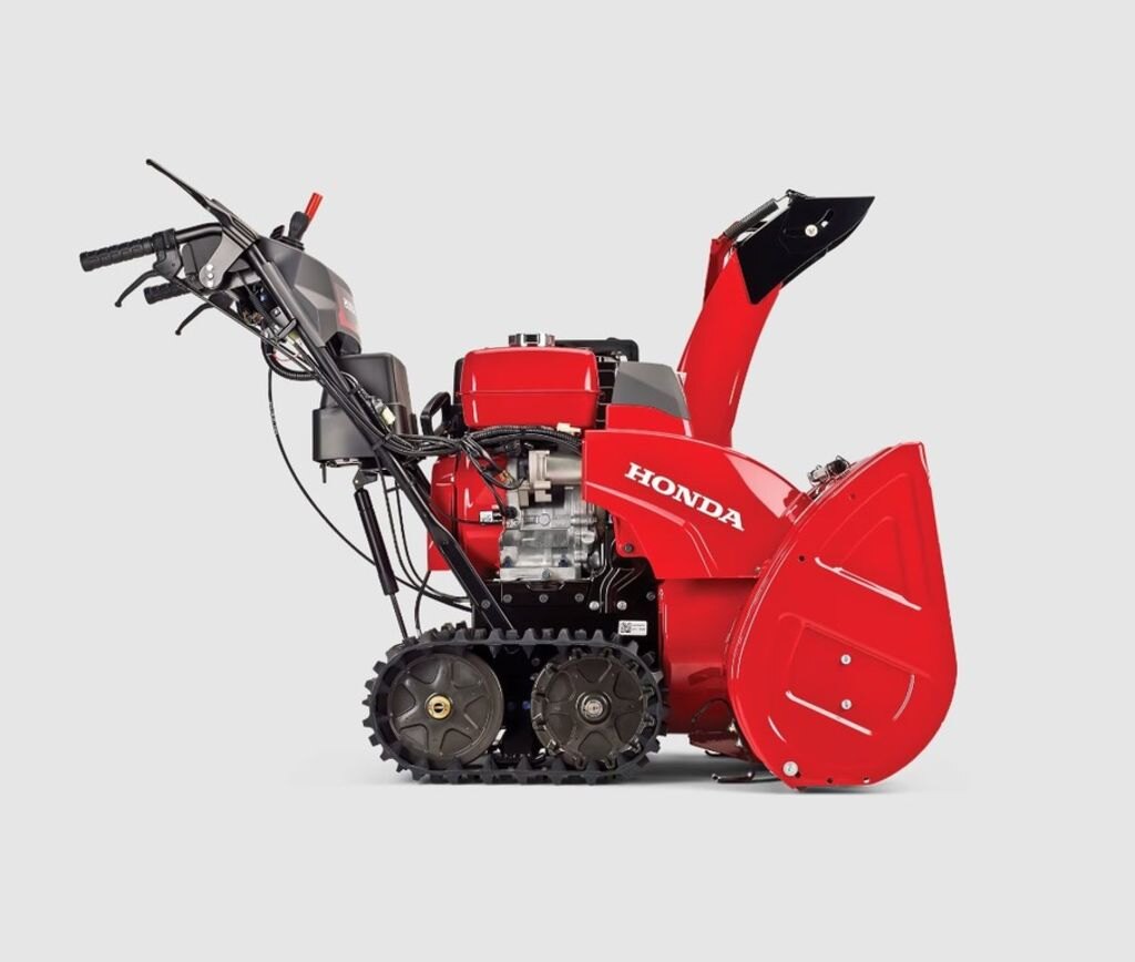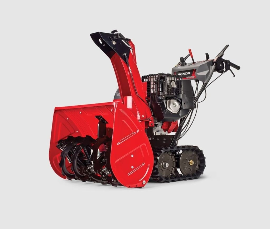 The full-featured, dual stage, track drive HSS1332ACTD is powered by the reliable, easy starting Honda GX390T2 commercial grade OHV (overhead valve) engine, clears a path 81.0 cm (31.9 in) wide and 55.0 cm (21.7 in) high, and provides snow discharge up to an amazing 75 metric tons (83 tons) per hour, at a distance of up to 17 m (56 ft). And it provides the ultimate in snow clearing convenience: Turn the key and go with 12 VDC on-board battery start, and control the height and direction of snow discharge with the touch of a finger using the convenient remote electric two-step chute with "Joystick" control. Should unwanted debris cause the auger to lock during operation, a Shear bolt Guard System alerts the operator and automatically stops the engine, preventing mechanical damage and unnecessary down-time. A standard hour meter monitors usage and helps to ensure that proper maintenance is carried out in order to keep the HSS1332ACTD running smoothly and at peak performance. The variable speed hydrostatic transmission features a single lever for quick switching between forward and reverse, and for accurate adjustment of ground speed without affecting auger rotation speed, while the steering assist drive system improves manoeuvrability with or without engine running with the new fingertip trigger steering control allowing precise turns for unmatched on-the-fly steering. The hydraulic-assist auger height adjustment control allows on-the-fly adjustment of auger height for optimum performance in varying snow conditions. It comes with a 3 year residential/commercial warranty, it's certified to meet or exceed EPA emissions guidelines, it's highly operator-friendly, and the HSS1332ACTD has the Honda power and technology to clear the heaviest snowfalls and the largest areas with ease. Features May Include:
