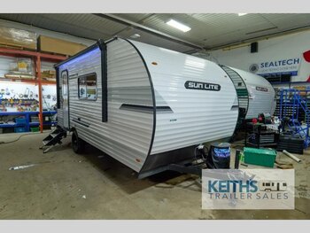 Head to your favorite campgrounds with your favorite person in this travel trailer! Relax each evening in true comfort on the front sofa while enjoying a snack that was stored in the kitchen pantry, and the sofa transforms into a full bed for sleeping at night too. The two person dinette offers a comfortable place to play games and enjoy your meals at that were prepared using the two-burner cooktop, 3.3 cu. ft. 12V refrigerator, and single bowl stainless steel sink. There are shelves and overhead cabinets throughout to store your items, and a rear corner wet bath to freshen up in each morning with a fantastic vent to eliminate any unwanted steam!