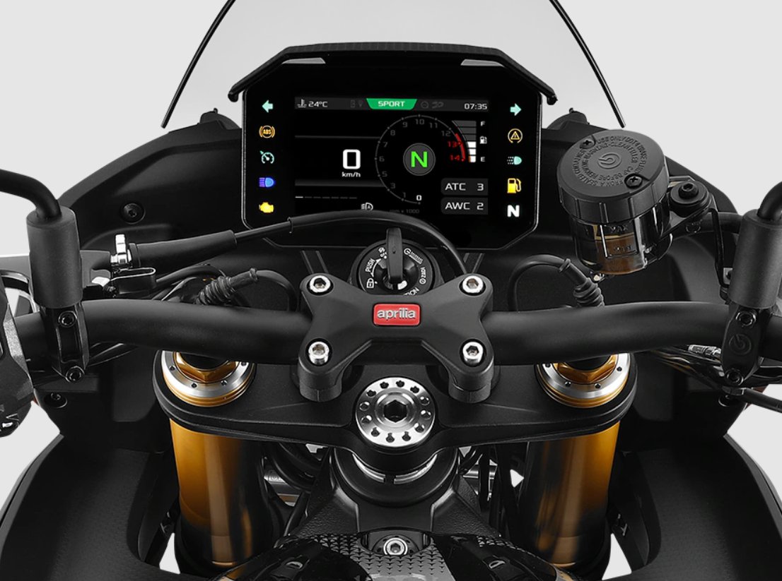 The electronics of the Tuono V4 Factory reach an extraordinary level of sophistication with a-PRC included as standard, six-axis IMU and a Ride-by-Wire electronic throttle. The three riding modes adjust Cornering ABS on three levels and manage all rider assistance systems, including adjustable Traction Control, Wheelie Control, three Aprilia Engine Map settings and Engine Brake calibration on three levels. The Track Pack comes standard, enabling track-focused features such as Launch Control for lightning-fast starts, Pit Limiter to regulate speed and Dashboard Race mode with an optimised display. Among the available accessories, the Race Pack includes the GPS Module for electronic Corner By Corner adjustments, while the Suspension Pack, with its Corner By Corner function, allows sector-by-sector management of the Öhlins Smart EC 2.0 semi-active suspension settings. |