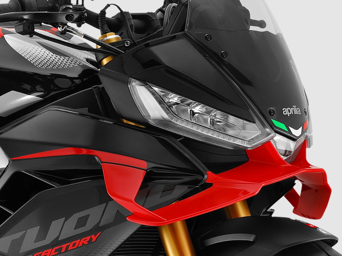 The aerodynamics of the Tuono V4 Factory have been developed to ensure exceptional stability, even at high speeds. The double overlapping wing, fine-tuned through wind tunnel testing, increases vertical downforce, improving grip and reducing front-end lift. Its winglet layout, derived from MotoGP experience, delivers unprecedented cornering precision. The compact half-fairing, fixed to the frame, provides protection without compromising agility. The integration of the rear lights into the licence plate holder optimises forms and airflow, with grooves and under-tail surfaces that evoke the gills of a manta ray. |