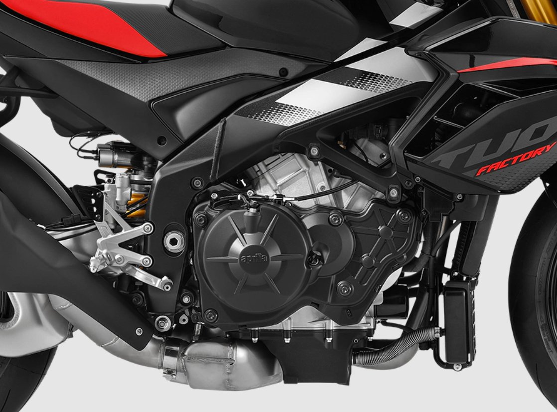 The beating heart of the Tuono is its 65° V 1099 cc engine, which conforms with Euro 5+ standards. The use of 52-mm throttle bodies makes it capable of max power of 180 hp at 11800 rpm and peak torque of 121 Nm at 9650 rpm, delivering the performance of a true supersport bike. |