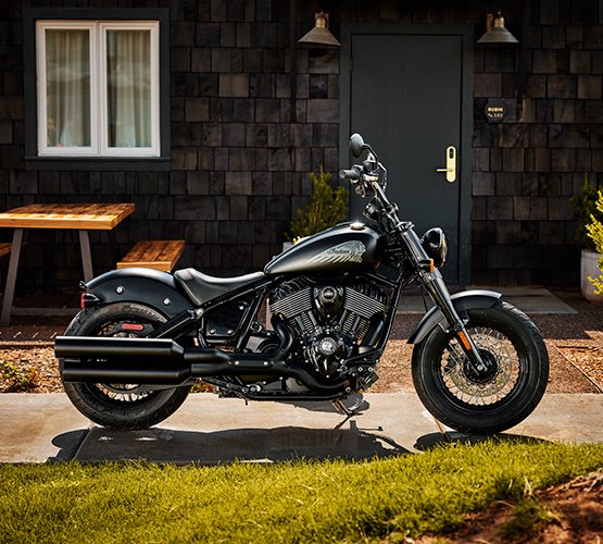 Loaded with attitude and blacked-out premium gloss black finishes with bobbed fenders. A welded steel tube frame, large headlight bucket with nacelle, and covered forks and rear shocks give a nod to traditional bobber style and deliver a visually striking experience.
