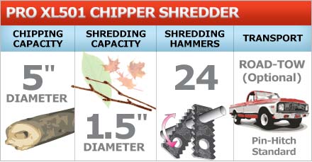 The PRO XL501 Chipper Shredder does it all. Its shredding action is produced by 24 serrated, free-swinging hammers in combination with our unique Shark-Teeth™ Shearing Fins. This superior shedding technology reduces lighter materials 20:1...pulverizing leaves, sticks and other yard and garden waste (up to 1.5" thick) into a fine mulch that you can compost or till into your soil. And its side chipper chute will demolish branches up to 5" in diameter. The PRO XL501 lets you get all of your yard cleanup done with one versatile machine. |