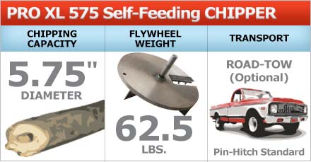 Heavy-Duty Flywheel The key to efficient wood chipping is the rotating mass created by the flywheel on which the chipper knife is mounted. The PRO XL575 Self-Feeding model features a 20" diameter flywheel that weighs a hefty 62.5 pounds. It spins at 144 mph and takes an amazing 40 "bites" per second! |