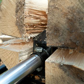 Switching from horizontal to vertical mode (or vice versa) takes only a few seconds. Just slip out a pin, rotate the unit, and re-insert pin to lock it into position. Lets you split those really big rounds without lifting the log onto the beam. |