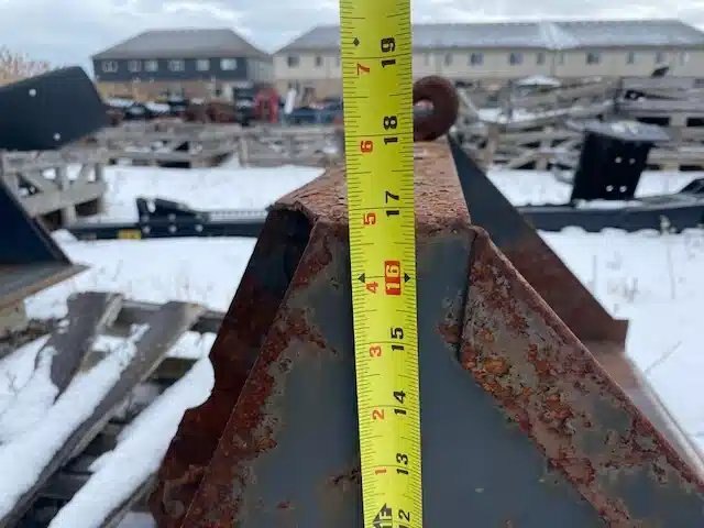 35" wide bucket, 17" high. Various quick-attach accessories. Sale on consignment. No tax.
