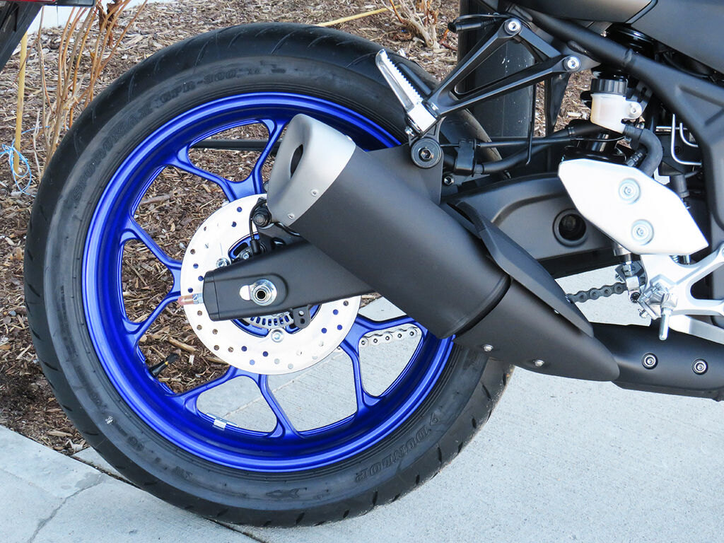 The MT-03 is equipped with a 573 mm (22.6 in.) long asymmetrical swingarm that provides a planted ride during braking, cornering and acceleration.