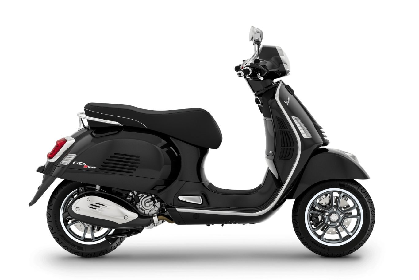 The Vespa Gts family's legendary aluminium frame is enhanced with chrome colours and black details such as the knobs, rubber footwell inserts and front shock absorber spring. The 12” wheels with 5-spoke rims in a graphite colour along with mirror-glossy sidewalls complete the bike's dynamic, personality-packed aesthetic.