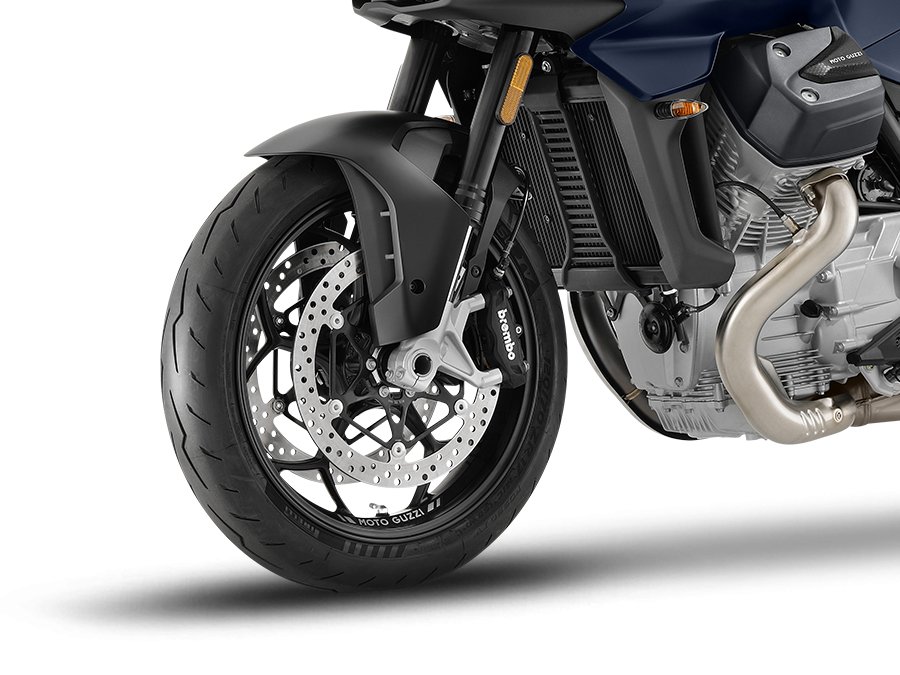 The braking system features two 320-mm floating front discs with Brembo radial-mounted callipers and a 280-mm rear disc. It is assisted by Cornering ABS, which ensures shorter braking distances and maximum safety even when cornering.