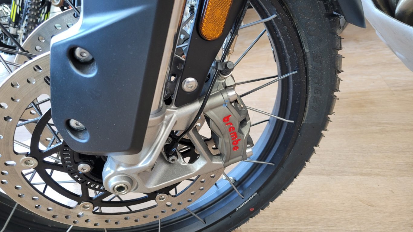 Brembo single piston caliper, OC-ABS, single 282mm disc. Rear master cylinder with remote reservoir.