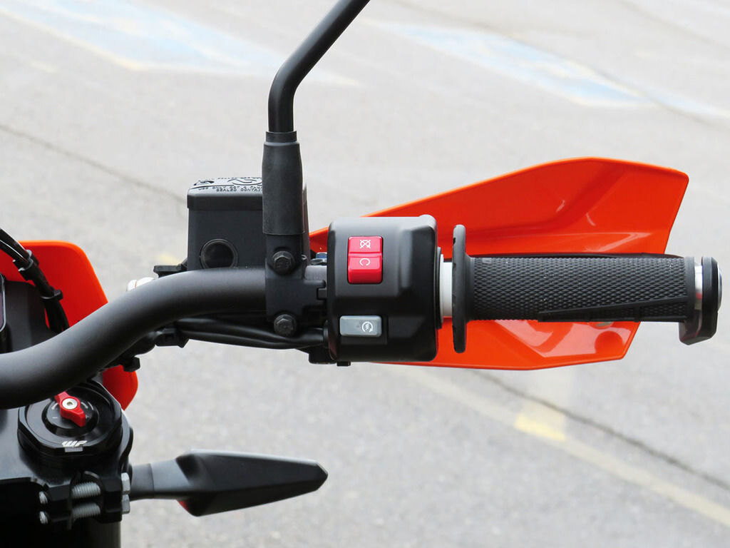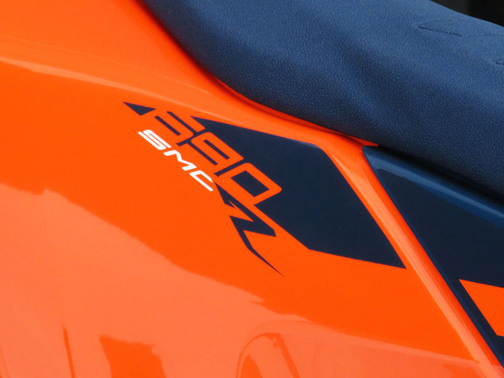 Every surface the rider touches on the KTM 690 SMC R - from the tank spoilers to the cable routing near the footpegs - has been optimized for maximum performance. Ergonomically, riders have complete freedom of movement without any fear of hooking boots or uncomfortable riding positions when getting knees (an elbows) down.
